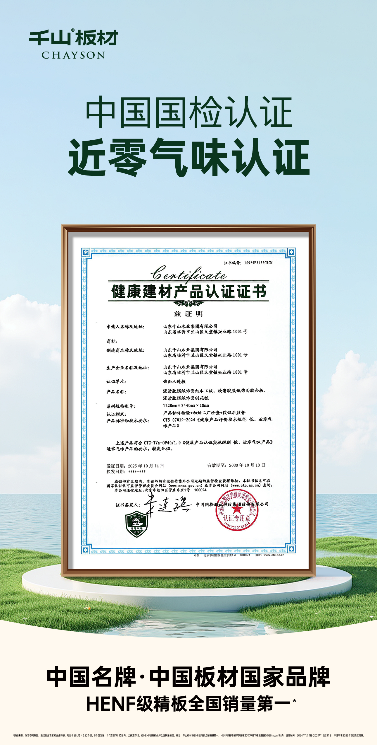 與此同時,千山板材核心產(chǎn)品憑借出色的環(huán)保性能與近乎零氣味的表現(xiàn),成功榮獲由中國國檢集團頒發(fā)的近零氣味健康建材產(chǎn)品認證證書。這一認證充分彰顯了千山板材在降低 TVOC 等污染物、攻克室內(nèi)異味難題方面的深厚技術實力。