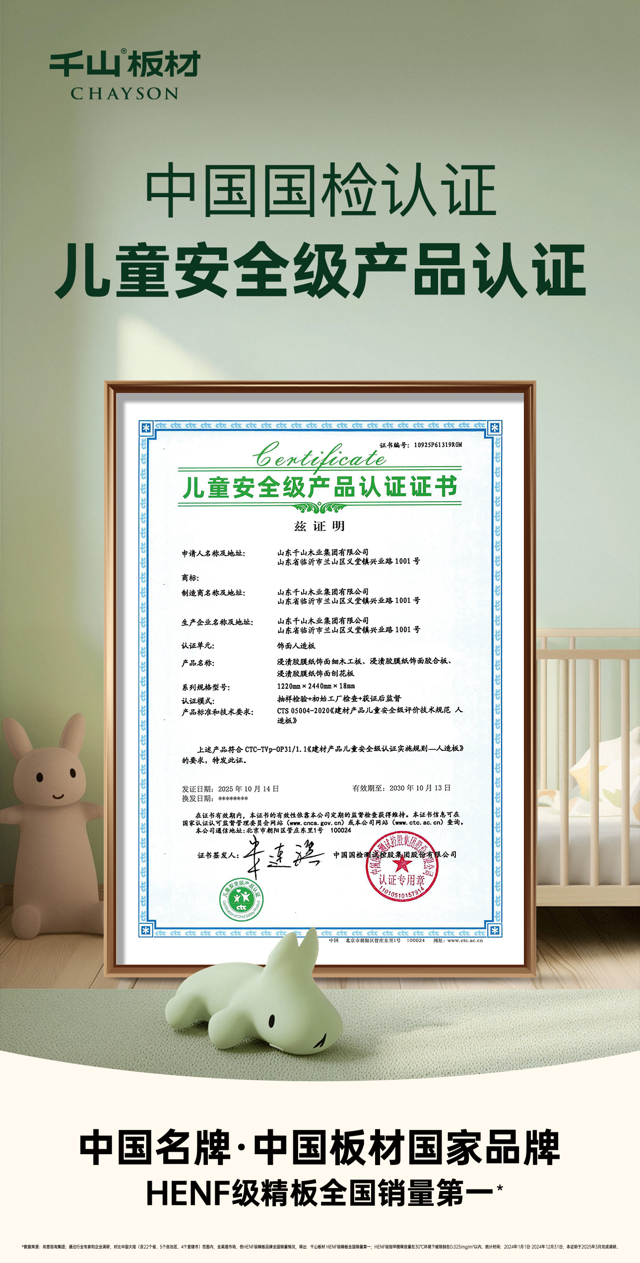 特別在孩子成長的世界里,每一寸空間的質(zhì)量、每一息空氣的安全,都牽動著父母的心。而千山板材憑借卓越的環(huán)保標準和安全性能,榮獲“兒童安全級認證”和“健康建材產(chǎn)品認證證書”雙項權(quán)威認可,為兒童家居環(huán)境筑起一道堅實防線。