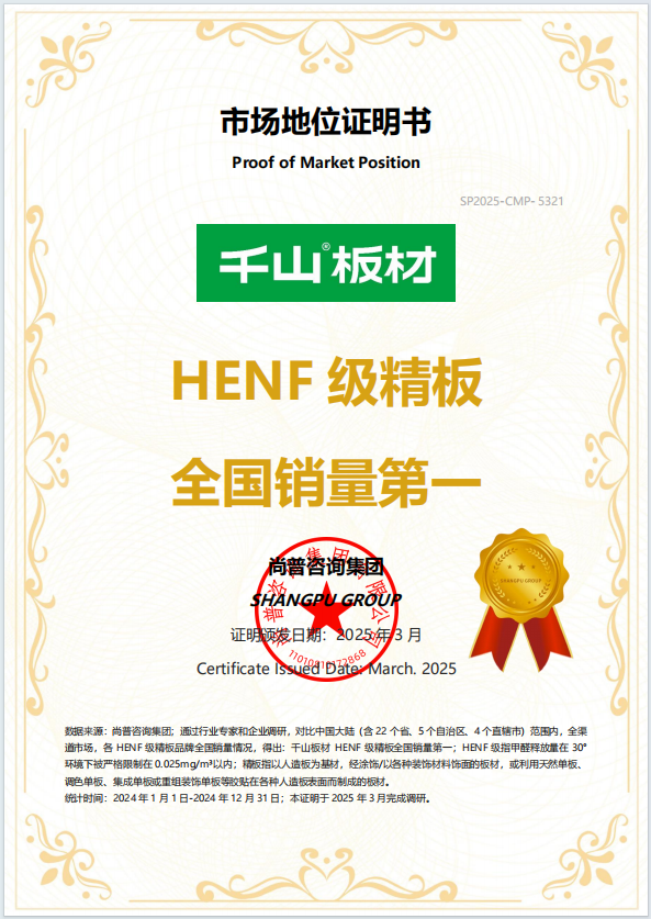 28年老牌板材大廠(chǎng)的深厚積淀,是千山高質(zhì)價(jià)比的堅(jiān)實(shí)后盾。作為中國(guó)板材國(guó)家品牌、HENF級(jí)精板全國(guó)銷(xiāo)量第一品牌,千山擁有全方位的品質(zhì)認(rèn)證體系——HENF級(jí)環(huán)保認(rèn)證、兒童安全認(rèn)證、近0氣味認(rèn)證,自主研發(fā)的凈醛、抗菌、抗病毒技術(shù)均獲得權(quán)威檢測(cè)報(bào)告支持。依托成熟的國(guó)產(chǎn)智能化供應(yīng)鏈,我們實(shí)現(xiàn)產(chǎn)能穩(wěn)定、品控嚴(yán)格、成本可控的三重保障,讓高端品質(zhì)板材以親民價(jià)格落地,真正做到“好板不貴、品質(zhì)可鑒”。