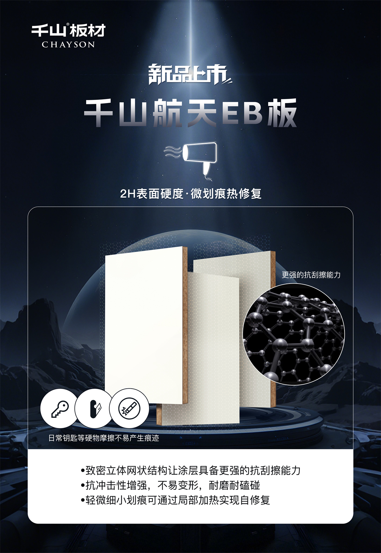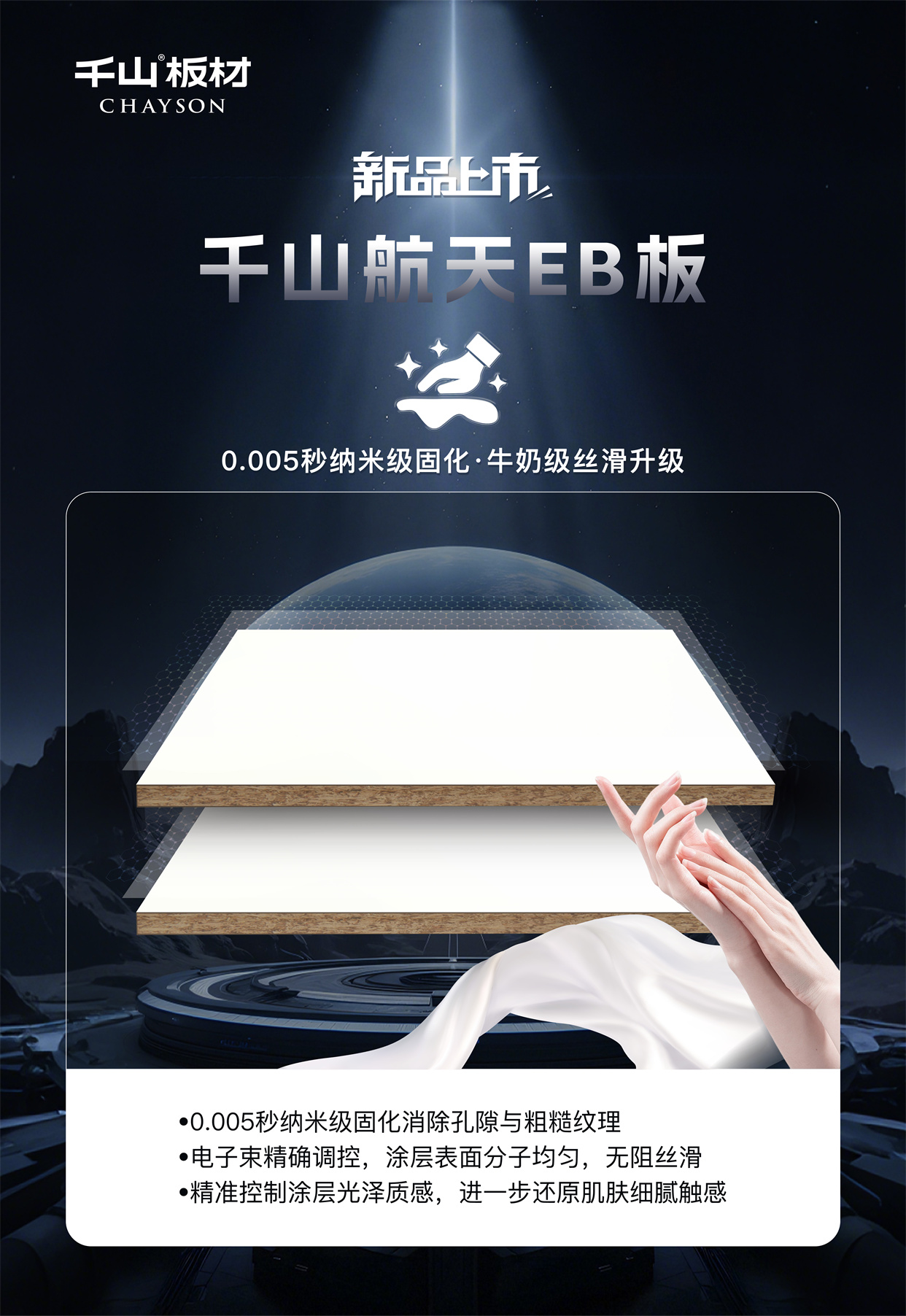 千山板材汲取航天科技靈感,重磅推出新一代高端門板產(chǎn)品——千山航天EB板,以“黑科技”工藝,將卓越的物理性能與高級質(zhì)感完美融合,為我們的家居空間披上“高能鎧甲”!